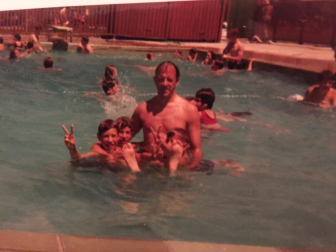 The four boys in my Mom’s life. Once again, the stupid peace signs. I’m behind my brother’s foot. If a park had a pool, it was cool.